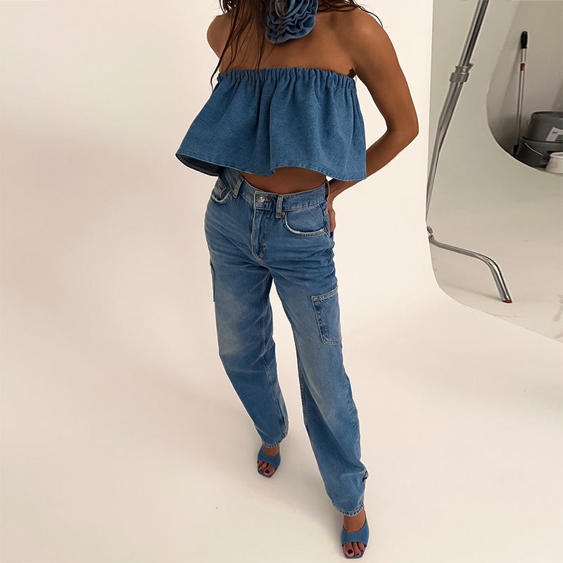 Denim Flower Collar Top With A Bra For Women